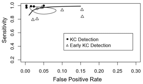 The Pentacam tomography system was the most commonly used corneal imaging device for both the KC and early KC categories. In Figure 4, we compare studies that used the Pentacam data set to diagnose KC and early KC. Diagnostic efficiency for detecting KC was superior to that for early KC, as shown by the higher sensitivity (y-axis) and specificity (x-axis) in the plot.