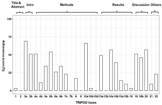 We evaluated the reporting completeness of machine learning research in this study by referring to the TRIPOD (transparent reporting of a multivariable prediction model for individual prognosis or diagnosis; www.tripod-statement.org (accessed on 7 June 2021)) statement relevant to model development. This statement contains a 20-item checklist, totaling 31 items when all sub-items are included. The checklist includes questions about the title, abstract, background, methods, results, discussion, supplementary material, and funding information. Two items (5c, i.e., “Give details of treatments received, if relevant”, and 11, i.e., “Provide details on how risk groups were created, if done”) were omitted since they were irrelevant to the research covered in this review. Each study was therefore evaluated on a total of either 28 or 29 possible items. This total number of items varied between 28 and 29 since item 14b (i.e., “If nothing on univariable analysis (in methods or results) is reported, score not applicable”) may be rated as “not applicable” and was thus omitted from the calculation of reporting adherence. If a study had data for several models, we extracted data for the model with the highest performance. Each included item received a score of “1” for adherence and a score of “0” for non-adherence. Multiple items (items 1, 2, 3a, 4b, 5a, 6a, 7a, 7b, 9, 10a, 10b, 10d, 13a, 13b, 14a, 15a, 16, 17, 20 and 22) in the TRIPOD analysis were derived from several sub-items (the sub-items for each number can be found in www.tripod-statement.org (accessed on 7 June 2021)). The score was therefore determined by the combination of several elements rather than a single element. The results of each TRIPOD item for each paper and the level of reporting adherence for each TRIPOD item were documented systematically in a spreadsheet.