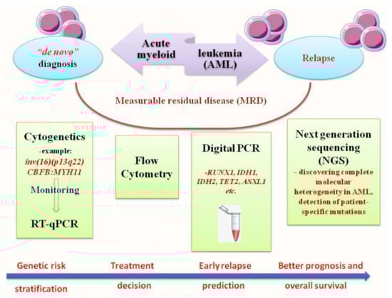 The detection of leukemic cells moved in the last two decades from immune-phenotyping to polymerase chain reaction (PCR) and real-time quantitative PCR (RT-qPCR) [18]. RT-qPCR has been consolidated not only for gene expression measurement and common fusion transcripts detection but also for genetic mutations in genes, such as NPM1, FLT3-ITD, CEBPA, IDH1/2, KIT, RAS, RUNX1 and TP53 or gene overexpression (WT1). It is commonly used as a standardized method in hematology laboratories to obtain a diagnosis and to monitor the kinetics of MRD without inter-laboratory mismatch [18,19]. This technique was shown to be reproducible, accurate and highly sensitive for MRD monitoring, with a significant capacity in predicting prognosis, treatment effectiveness and relapse risk [20] (Figure 2).