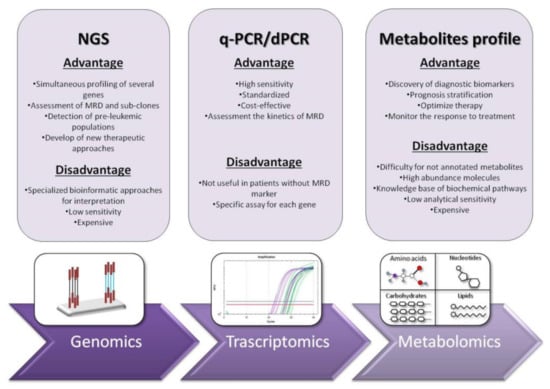 Although ongoing studies have shown improvement in the outcome of AML patients, the real prognosis remains poor. Approximately 70% of patients aged ≥65 died within one year of diagnosis, despite the newly available target treatment options [14]. The molecular identity of AML, enhanced and revised several times from 1976 to 2016, proved its intrinsic genetic complexity. In this direction, diagnosis and prognosis profiles are currently achieved with more sensitive techniques and are used in tandem with canonical methods such as flow cytometry and cytogenetics in order to improve the monitoring of minimal residual disease (MRD), to optimize the treatment, increase overall survival (OS) and to prevent relapse [15,16,17]. In this review, we outlined molecular testing advised for AML diagnosis and measurable residual disease (MRD) assessment in order to translate molecular techniques into clinical practice. Our major focus will be RT-qPCR, digital PCR (ddPCR), next-generation sequencing (NGS) and the recent most attractive approach—metabolomic profiling (Figure 1).