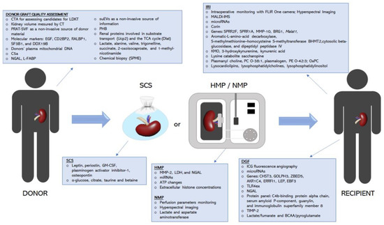 In this paper, we review and evaluate the limits and advantages of current conventional diagnostic methods and a range of new potential tools (from the last five years) with respect to donor graft-quality assessment, the identification of ischemia-reperfusion injury (IRI), perfusion control, and the prediction of DGF (Figure 1).