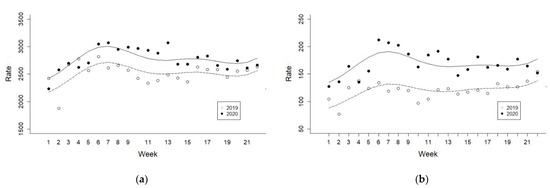 The distribution and weekly trends associated with patients with psychiatric illness per 100,000 patients visiting the ED during the before-COVID and during-COVID periods are shown in Figure 1.