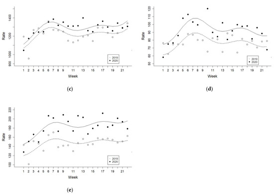 Weekly trends of patients with psychiatric illnesses per 100,000 patients visiting the ED during and before the COVID-19 pandemic. All y axes are the rate of patients per 100,000 ED visits (a) all psychiatric disorders, (b) psychiatric self-harm, (c) principal psychiatric, (d) principal psychosis, and (e) principal mood disorder.