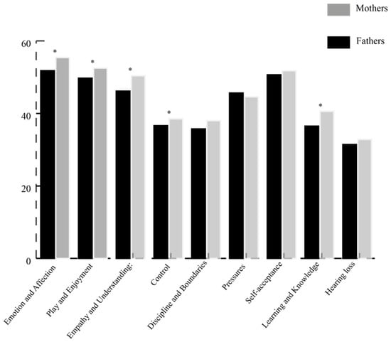 Mean scores of fathers’ and mothers’ parental self-efficacy subscales. * p < 0.05.