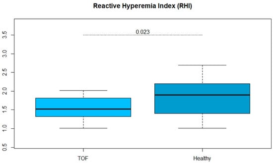 In patients with ToF, there is only a small study [] of eleven children and a small control group that suggests that children with ToF, already at a young age, experience changes in vascular function and structure. In our study, we can only confirm these results on one point, as vascular function of the microcirculation was also impaired in our investigation. Although different methods were used in our study (flow-mediated dilation [] and peripheral arterial tonometry), the results remained the same. It suggests that there is a generalized vascular disturbance of the microcirculation in patients with ToF, independent of age. Multifactorial reasons come into play here. Endothelial dysfunction might be related to postoperative hemodynamic abnormalities, such as changes in transmural pressure [,], flow patterns [] and structure of smooth muscle cells of the aortic wall []. Lifestyle factors, such as impaired physical activity and obesity, are also always discussed in this context. Unfortunately, this study does not address physical activity behavior, but recent reports suggest that there is hardly any difference between patients with CHD and healthy peers in general [,].