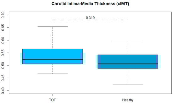 Interestingly, the endothelial dysfunction seems not to translate into results in morphological change of the vessel structure, as cIMT is comparable to healthy controls. Naturally, this should be the case, as endothelial dysfunction should also affect the structure of the walls and translate into a thicker cIMT. However, it should be stated that functional limitation at the endothelium precedes a thickening of the wall structures. Since the participants in our study are still young, the wall structures may not yet be affected by means of cIMT. However, studies in children and in adults have not yet been able to show clearly that the wall structures (intima-media thickness) in a ToF collective were thicker [,]. Neither could a functional impairment of the vasculature be shown [,].