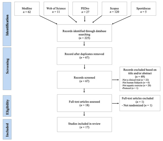 The database search identified 225 records. After the elimination of duplicates, 67 records were selected for their relevant content. During the analysis of the title and summary, 49 articles were excluded. Eighteen potentially relevant full-text articles were evaluated and one of them was excluded due to the lack of a control group (not RCT). Therefore, a total of 17 studies were included in this revision (Figure 1). Data were collected ethically and in ways which addressed the research questions. All the studies produced valuable research with clear statements of findings.