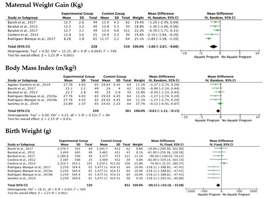 The analysis of the included studies showed a low level of heterogeneity based on I2 and Chi2 in the variable body mass index (m/kg2), while in maternal weight gain (Kg) and birth weight (g) had a high heterogeneity, being Chi2 = 15.15 and 18.31 respectively (Figure 2). The analysis of the effects of aquatic or combined water/land programs on maternal weight gain showed different trend, with particularly striking results coming from the Rodriguez-Blanque et al. study [25], in which a water-based program was compared to routine prenatal care, and where significant, improvements in the control of maternal weight were demonstrated by the water-based program.