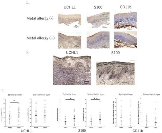 Profile of infiltrated cells in the mucosa of oral lichen planus lesions with immuno-histochemistry. (a) UCHL1 and S100 staining showed the difference between metal allergy-negative and -positive tissue. 100× magnification images. (b) UCHL1 and S100-positive cells in the epithelial tissues were more abundant in metal allergy-positive patients. Images with 200× magnification. (c) UCHL1 and S100-positive cells in the epithelial tissues were significantly more abundant in metal allergy-positive patients than in allergy-negative patients. Images were analyzed via Keyence Software. The tissue area was separated into epithelial and subepithelial areas with a border line. The percentage of cell number expressing each marker was calculated by dividing the total area of cells by the total area of the tissue, then converting to a percentage. Data are shown as mean ± SD. * p < 0.05, ** p < 0.01; unpaired t-test.