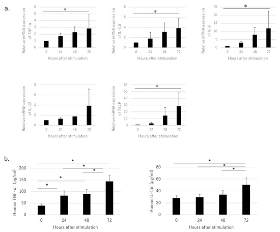 The expression of tumor necrosis factor (TNF)-α, interleukin (IL)-1β, IL-6, TSLP, and TSLPR mRNA was up-regulated 72 h after stimulation in a time-dependent manner (Figure 2a). Similarly, enzyme-linked immunoassay analysis of the culture supernatant of HaCaT stimulated with NiCl2 showed that the production of TNF-α and IL-1β both increased significantly after stimulation (Figure 2b).