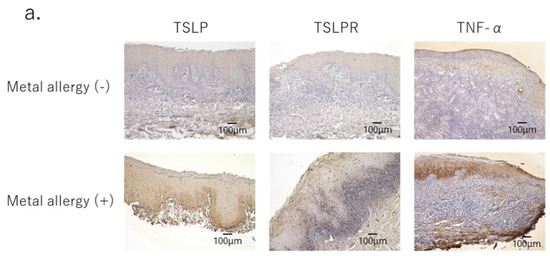 A survey of metal allergies reported in 2015 revealed that in epidemiological studies, a high percentage of patients with metal allergies also had atopic dermatitis, allergic rhinitis, and food allergies [29]. Our finding that TSLP-TSLPR expression is significantly elevated in patients with OLP and metal allergies may be key to unravelling the connections between these conditions in future studies.