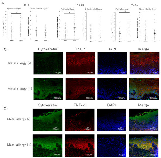 Pro-inflammatory cytokines secreted in oral lichen planus lesions. (a) TNF-α, TSLP, and TSLPR secretions were increased in the epithelial layer of oral lichen planus tissues in metal allergy-positive patients. Images with 100× magnification. (b) TSLP, TSLPR and TNF-α secretions were increased in the epithelial layer of oral lichen planus tissues in metal allergy-positive patients. * p < 0.05, ** p < 0.01; unpaired t-test. (c,d) TSLP and TNF-α secretions by keratinocytes were increased in the epithelial layer of oral lichen planus tissues in metal allergy-positive patients. (c) 200× magnification images, (d) 100× magnification images.