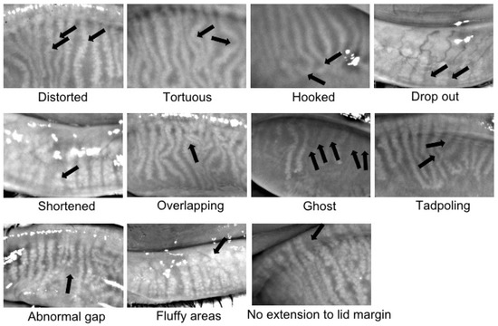 - Ban, Y.; Shimazaki-Den, S.; Tsubota, K.; Shimazaki, J. Morphological evaluation of meibomian glands using noncontact infrared meibography. Ocul. Surf. 2013, 11, 47–53. [Google Scholar] [CrossRef] [PubMed] [Green Version]