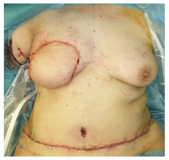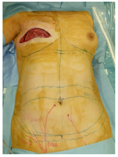 - Chen, R.; Mu, L.; Zhang, H.; Xin, M.; Luan, J.; Mu, D.; Liu, C.; Ji, K.; Hu, J.; Sun, J.; et al. Simultaneous Breast Reconstruction and Treatment of Breast Cancer–Related Upper Arm Lymphedema with Lymphatic Lower Abdominal Flap. Ann. Plast. Surg. 2014, 73 (Suppl. 1), S12–S17. [Google Scholar] [CrossRef]