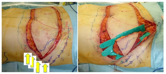 - Yoshimatsu, H.; Yamamoto, T.; Hayashi, A.; Iida, T. Proximal-to-Distally Elevated Superficial Circumflex Iliac Artery Perforator Flap Enabling Hybrid Reconstruction. Plast. Reconstr. Surg. 2016, 138, 910–922. [Google Scholar] [CrossRef] [PubMed] [Green Version]