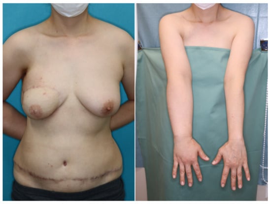 The flap is elevated in a prone position. Preoperatively, the course of the superficial branch of the SCIA and the location of the DIEP are marked using an ultrasound device [,]. The DIEP flap is elevated in an ordinary fashion. Reverse mapping using indocyanine green (ICG) lymphography is performed as described in a previous report []. The afferent lymphatic vessels and their draining lymph nodes are then identified using ICG lymphography, injecting ICG intradermally into the region []. The superficial branch of the SCIA is found and dissected through the caudal edge of the flap, as described in our previous report []. After confirmation of perfusion to the lymph nodes, a SCIP flap is designed, incorporating the corresponding lymphatic vessels. The thoracodorsal artery and its accompanying vein, or the serratus branch and its accompanying vein, are prepared as the recipient vessels. The lymphatic SCIP flap is transplanted before the DIEP flap transfer because the elevation of the lymphatic SCIP flap takes less time than that of the DIEP flap. After microsurgical anastomoses, the skin paddle is de-epithelialized, and the distal portion of the flap is sutured to the proximal upper arm, considering the axiality of the lymphatic vessels in the flap. The perfusion of the embedded lymphatic flap is monitored postoperatively using ultrasonography devices.