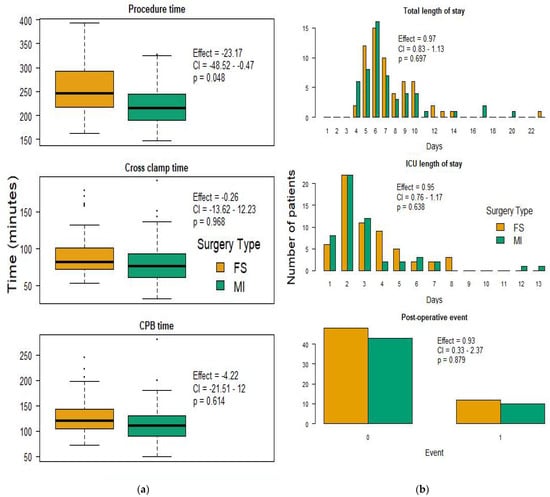 Perioperative time intervals and select postoperative outcomes. (a) Mean procedure, cross-clamp, and cardiopulmonary bypass (CPB) times in minutes comparing minimally invasive (MI; green) and full sternotomy (FS; yellow). (b) Comparison of patient postoperative intensive care unit (ICU) and total hospital length of stay in days and postoperative events, with 0 indicating no events and 1 representing adverse event occurrence.