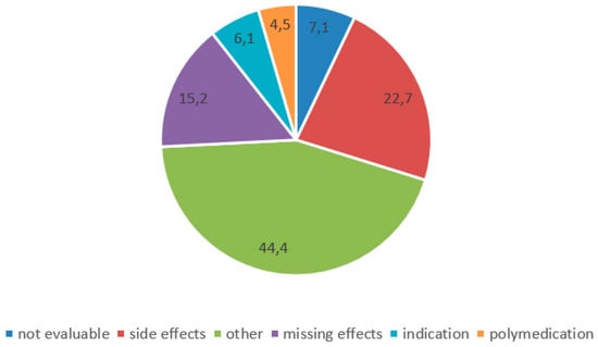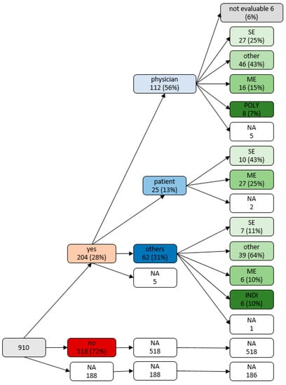Changes of medication after discharge were reported by 204 (22.4%) patients. These medication changes were mainly initiated by physicians (n = 112, 56.3%, by GP 74, by Neurologist 34, by other hospitals/rehabilitation centers 4); only a minority of patients reported initiating medication changes themselves (n = 25, 12.6%) (n = 62, 31.2% by others). Reasons for medication changes were side effects, missing effects and miscellaneous reasons (individual reasons such as planned operations, specific allergies, or unavailability of certain medications) (Figure 1). We summarized the initiators of changes and the corresponding reasons for change in a variable tree in Figure 2.