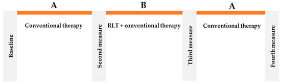 The experimental protocol was designed based on a reversal design (Single-subject research), also called the ABA, with three intervention periods: (A) conventional physiotherapy, (B) RLT and conventional therapy and (A) withdrawal of RLT. Each condition lasted for six weeks (Figure 1).