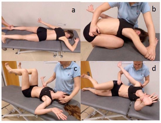 A rehabilitation program was administered based on RLT. Reflex locomotion presents two patterns, known as reflex crawling and reflex rolling []. These patterns of reflex locomotion are innate and can be accessed from specific positions and by pressing upon specific points in certain directions. Four positions were performed on all patients (Figure 2), two of which were reflex crawling (original position of reflex crawling and first position), while two were reflex rolling (first phase and second phase of rolling), for as long as the patient could tolerate these; otherwise, small modifications were made, ensuring the comfort of the individual involved. The stimulation points activated in the position of reflex crawling were mainly the medial epicondyle of the facial arm, the external protuberance of the calcaneus of the nuchal leg, the anterior superior iliac spine (ASIS) of the facial hemipelvis and the femoral condyle medial to the nuchal side. During the reflex rolling, the main points stimulated were, in supine lying, the 6th-7th intercostal space and the ASIS of the hemipelvis on the facial side; and, in side lying, the internal border of the scapula, the ASIS of the facial hemipelvis, the facial gluteus medius, the femoral condyle external to the nuchal side, the internal femoral condyle of the facial side and the external protuberance of the calcaneus of the nuchal side.