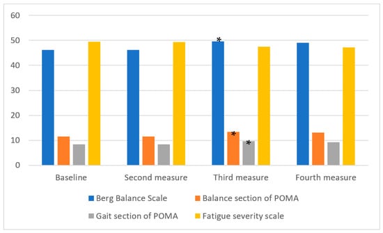 The Berg Balance Scale (BBS) [] was developed as a quantitative measure of the functional status of balance for the older person. The total score ranges between 0 (severely affected balance) to 56 (excellent balance). In this sense, several authors [,,] have confirmed that this scale presents appropriate levels of validity and reliability for the assessment of balance in patients with MS.