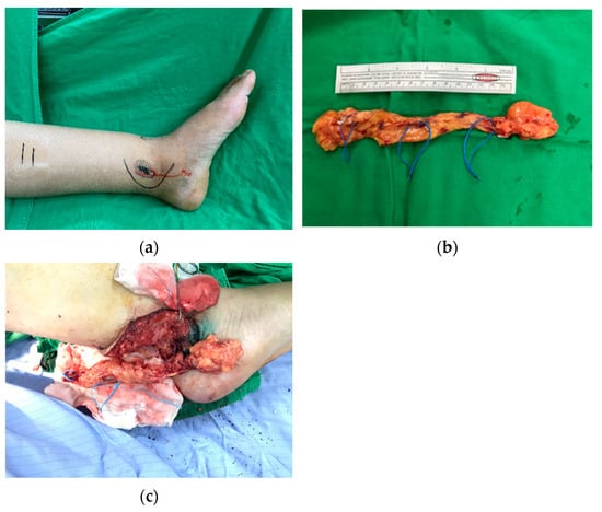 All patients underwent a combined procedure. A GE-VLNF transfer was combined with a different excisional procedure, according to the patient’s clinical grade. The GE-VLNF was harvested by a laparoscopic surgeon, as previously described [20]. All of the flaps were divided into two segments and transferred to both extremities at a the medial inframalleolar area (posterior tibial vessels) (Figure 1a–c). If a primary closure was not possible, a split-thickness skin graft was used to cover the flap in order to prevent external compression of the pedicle.