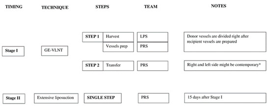 In 22 cases, a 2-stage approach was performed. Two weeks after bilateral GE-VLNT, an extensive therapeutic lipectomy with Brorson’s technique was carried out to reduce the lymphatic burden of the lower limbs [21]. Compression garments were applied immediately after the surgery. In seven cases, RRPP or modified Charles’ procedure and VLNT were performed in a single stage; in those cases, teamwork is necessary in order to complete a double reductive procedure with subsequent double lymph node transfer in reasonable operative time (we recommend building a reductive and a reconstructive team in order to avoid surgeon fatigue). The reductive techniques were described in our previous reports [22,23]. For the sake of clarity, a scheme was used to describe the surgical protocol used for each clinical grade (Figure 2 and Figure 3).