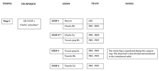 The timing of a combined surgery is really important, especially in bilateral extensive surgeries. During the combined modified Charles’ procedure with GE-VLNT, if possible, we prefer to work divided into three teams alternating in multiple well-defined steps. After the VLNF is harvested laparoscopically, one team takes care of the reductive procedure, and another team performs the microsurgical steps in order to reduce the operative time and the surgeon’s fatigue. The surgical steps are described in Figure 3. In case only one microscope is available, we recommend first performing anastomoses of the entire flap to one ankle with the aim to interrupt the ischemia time. After the recipient vessels of the contralateral ankle are prepared, the distal half of the flap is divided and transferred (Figure 1c).