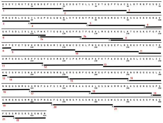 Synthesized TDP-43 peptides aligned with the complete sequence of TDP-43. The sequence starts with the N-terminus at the upper left corner of the figure and ends with the 414th residue at the bottom. Peptides are represented by black bars with cysteine tags and are numbered at the left.