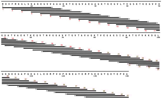 Overlapping α-synuclein peptides aligned with the complete sequence of α-synuclein. The sequence starts with the N-terminus at the upper left corner of the figure and ends with the 140th residue at the lower right corner. Peptides are represented by black bars with cysteine tags and are numbered at the left.