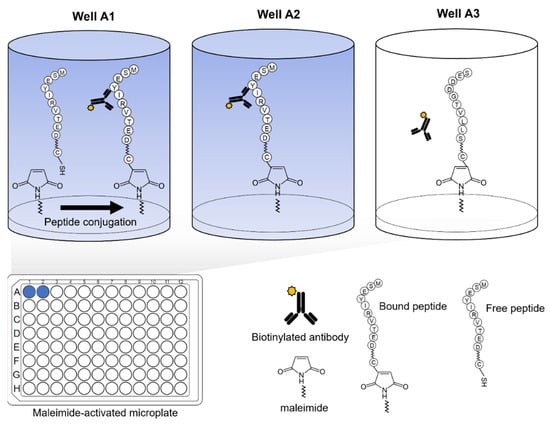 After washing all coated wells three times with PBS with 0.05% Tween-20 (PBST), 100 µL of 10 µg/mL of L-cysteine (Sigma, Burlington, MA, USA) dissolved in PBS was added to all wells and left to incubate at room temperature for 1 h to block remaining exposed maleimide groups. After washing three times with PBST, 100 µL of 0.1 µg/mL of interacting recombinant protein to be tested was added next and left to incubate for 1 h at 37 °C. In mapping the epitopes of the antibodies for each peptide, no recombinant protein was added, and the antibodies were directly added instead on to the coated wells (Figure 3). After washing, 100 µL of 0.1 µg/mL of the biotinylated detection antibody diluted in PBST (10% BlockAce; Bio-Rad, Hercules, CA, USA) was added and left to incubate for 1 h at 37 °C. After washing, 100 µL of streptavidin conjugated with horseradish peroxidase (ThermoScientific, Waltham, MA, USA) was diluted 5000 times in PBST with 10% BlockAce and left to incubate for 30 min at room temperature. After a final washing, 100 µL of tetramethylbenzidine (TMB; ThermoScientific) was added and left to incubate at room temperature until a significant color change relative to the background was observed (around 15 to 20 min). The reaction was stopped using 50 µL of 1 M sulfuric acid, and absorbance values were measured at 450 nm using a PerkinElmer Victor 3 multilabel reader.