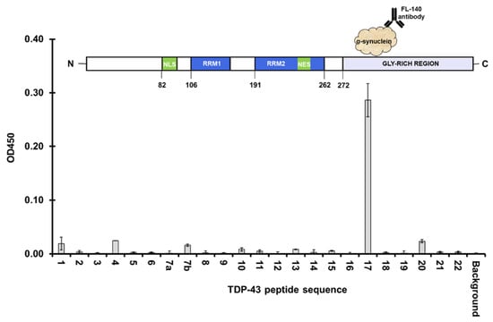 Twenty-three non-overlapping peptides that cover the complete amino acid sequence of TDP-43 (Figure 1), and 43 overlapping peptides that cover alpha synuclein (Figure 2) were synthesized (Lugen Sci Co., Ltd., Bucheon, Korea). Each peptide has a length of 18 to 20 amino acids, except 2 that cover the first few residues of RRM-1 (13-mers) and the last residues of the LCD (10-mer) in TDP-43. A terminal cysteine was added to all peptides without an internal cysteine residue. These lyophilized peptides were stored in an airtight container inside a dehumidifier at room temperature until use. In preparing the peptides to be coated on to a maleimide-activated microplate (ThermoScientific®, Waltham, MA, USA), 0.5 to 1.0 mg peptide were dissolved in an appropriate volume of dimethyl sulfoxide (DMSO, Amresco, Dallas, TX, USA) to make a stock solution of 10 mg/mL. These peptides were then diluted to a final concentration of 5 µg/mL in phosphate buffer saline (PBS) solution with 10 mM EDTA. One hundred µL of each peptide solution was then transferred to a corresponding well of a maleimide-activated plate (ThermoScientific®, Waltham, MA, USA), and incubated overnight at 4 °C.