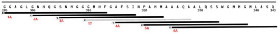 Design of overlapping TDP-43 peptides relative to the region of interest (aa 310–329). Only peptides 1A, 3A, and 4A were successfully synthesized.