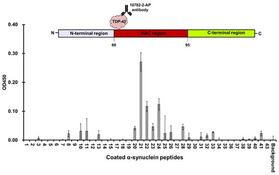 The following are available online at https://www.mdpi.com/article/10.3390/jcm11030573/s1, Figure S1: Normalized bound α-synuclein to overlapping peptides of TDP-43, Figure S2: Conventional ELISA of serially diluted recombinant α-synuclein bound to fixed concentrations of TDP-43, and vice versa.