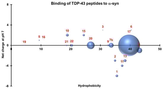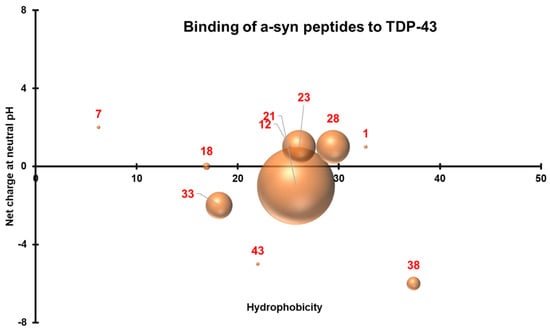 Three-dimensional scatterplot of TDP-43 peptides based on their hydrophobicity indices, net charge at pH 7.0, and their interactions with α-synuclein. Significant interactions occur with neutral peptides with hydrophobicity indices that fall within 20–40.