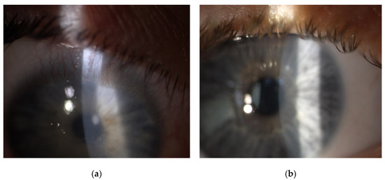 Despite new reports on cases of patients with sterile corneal infiltrates after CXL procedures, their small number makes it difficult to determine the etiology and mechanism of their formation. Over the years, several authors have put forward several hypotheses. According to the literature, 87 people with this complication after the CXL procedure have been described so far [7,8,9,10,11,14,15,16,17,18,19,20,21,22,23]. Comparing this to the number of CXL procedures performed in the world, it is a rare complication. However, it cannot be underestimated, and—according to the authors of this article—quick diagnosis has an impact on the method of treatment and possible late complications. The first case was described in 2009 by Angunawela et al. [7]. He advanced a hypothesis that in patients post-CXL procedure, the phenomenon of increased cellular resistance (CMI) to the Staphylococcus aureus antigen occurs in the area with increased amounts of tears by the eye shield. The author himself followed the example of a study in which a similar response was observed in patients with sterile peripheral keratitis who suffered from blepharitis [24]. Today, this hypothesis is still valid, and many authors use it not only post-CXL but also after refractive procedures [23,25]. Recent reports suggest a strong relationship between vernal keratoconjunctivitis and Down’s syndrome being risk factors for the development of sterile corneal infiltrates [8]. Vigorous rubbing of eyes, inadequate hygiene of the eyelids margin, as well as their impaired function, may lead to a greater accumulation of staphylococcal exotoxin on their margins. In the study described here, patients did not report allergies nor were they diagnosed with vernal keratoconjunctivitis. Nevertheless, frequent rubbing of the eyes and poor hygiene cannot be excluded, especially since the complication concerned young men who were reluctant to describe their ailments. Therefore, in one of the patients who underwent the CXL procedure on the second eye, after previous keratitis in the first eye, the decision was made to take special care and introduce additional anti-inflammatory protection. Therefore, it seems reasonable to carry out all the steps before the CXL procedure so that the eye surface is stable and the immune induction after the procedure as small as possible. Preventive measures were taken by applying eyelid margin hygiene two weeks before the procedure and the application of a steroid in the form of drops seven days before the procedure.