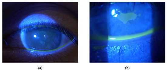 Four cases of sterile corneal infiltrate were found in the analyzed group. They were men in the age range (16–28) years, the average age being 20.3. The overall incidence rate in the centre was 0.7%. The first check-up was scheduled 7 days after the surgery. Only one patient came in a day earlier than the designated appointment; the rest of the patients attended on the appointed date reporting unrelenting redness, pain in the eye that had undergone the procedure, and progressive deterioration of vision. The average time of intensification of symptoms was 3.5 days (2–5 days) after the surgery. During slit lamp examination, 1 × 1 mm paracentral corneal infiltrate was found in two patients (Figure 1a,b), and paracentral infiltrate of about 3 × 2.5 mm in the next two patients was found (Figure 2a,b). Infiltrates were not staining with fluorescein (Figure 3a). Moreover, delayed healing of epithelium in one patient occurred in the form of stained erosion (Figure 3b). Swabs and scrapings were taken from all patients to exclude infectious corneal infiltrate. Both were taken directly onto blood agar and Sabouraud medium with a coarse brush to detect bacterial and fungal infections. The results of microbiological tests were negative. During the first check-up, each patient had the eye shield removed and treatment with levofloxacin and dexamethasone was continued five times a day until smear results were ready. After the results were obtained, patients with smaller infiltrate had the antibiotic reduced to three times a day, and dexamethasone drops increased to seven times a day. In patients with greater infiltration, an increased dose of the antibiotic was continued for a certain period due to the suspicion of infectious infiltrate despite a negative culture result, and an increased dose of the steroid was administered with great caution and required more frequent check-ups at the clinic (every three days). Detailed times of treatments and symptom relief are presented in Table 1. Inflammatory infiltrates resolved in all of the patients observed. In two patients, the withdrawing infiltrate left opacification in the stroma.
