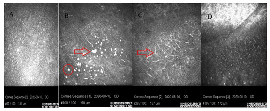 Images of confocal microscopy of patients with sterile corneal infiltrate after cross-linking procedure. (A) Stimulated epithelial cells with visible cell nuclei. (B) In the layer of epithelial cells, there are round inflammatory cells (circle), single Langerhans cells and hyperreflective apoptotic epithelial cells (larger than the inflammatory cells-arrow). (C) In deep layers of the epithelium and Bowman’s layer, there are numerous Langerhans cells with protrusions (arrow). (D) Oblique scan-from bottom, a layer of stimulated epithelium through the Bowman’s layer with LG cells, hyperreflective fibrous tissue visible in anterior stroma (from top).