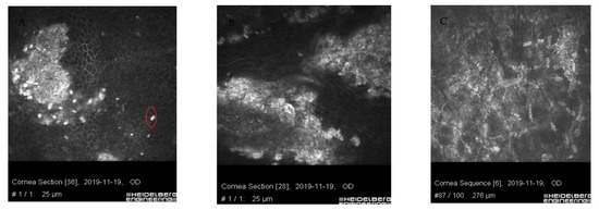 Images of confocal microscopy of patients with sterile corneal infiltrate after cross-linking procedure. Residual form of keratitis (A,B) with hyperreflective tissue corresponding to scar tissue, irregularly structured epithelial cells with impacted apoptotic hyperreflective cells (circle). (C) Corneal stroma layer with hyperreflective structures corresponding to fibrosis and normal keratocyte nuclei.