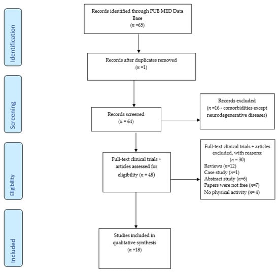 In this sense, 65 of the most representative papers from the PUB MED electronic database were selected. The papers focused on received interventions at home during the restrictions imposed by the COVID-19 pandemic, through online digital platforms or semi-structured interviews, regarding physical exercise programs, development daily household activities, online interviews regarding physical and mental state of the participants or eating habits approached during this period. After the elimination of duplicate papers, 64 studies remained to be scanned, and of these, another 16 papers that did not refer to neurodegenerative diseases were eliminated. Of the 48 full-text clinical trials and articles assessed for eligibility, 30 were excluded for the following reasons: 12 studies were systematic reviews, 1 paper was a case study, 6 papers were abstract studies, 7 studies were not free to access and 4 papers did not refer to physical activity. Thus, in the end, only 18 studies that addressed healthy adults and patients with: Parkinson’s disease, Alzheimer’s disease, Lewy body disease, Frontotemporal dementia and associated diseases (Vascular dementia, Myasthenia gravis), will be discussed for qualitative synthesis.