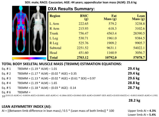 Dual-energy X-ray absorptiometry report of body composition (bone mineral content—BMC; fat mass; lean mass) for one representative Caucasian male subject (age 44 years). Results of the total body skeletal muscle mass (TBSMM) estimation for the representative subject according to the six equations previously proposed by Kim et al. [10,11]. Results of the lean asymmetry index estimation for the upper limbs (4.3%) and for the lower limbs (5.4%) of the representative subject. Coefficients for Equation #3. SEX: female = 0, male = 1. Coefficients for Equation #6. SEX: female = 1, male = 0; RACE: Caucasian = 0, African American = 1.