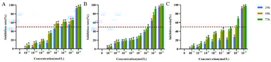 Figure 2. The inhibition of proliferation of HTEpiC at different concentrations of paclitaxel, mitomycin C, and rapamycin. * represents a statistically significant difference compared to the negative control group, p < 0.05. (A): The inhibition of proliferation of HTEpiC at different concentrations of paclitaxel. (B): The inhibition of proliferation of HTEpiC at different concentrations of mitomycin C. (C): The inhibition of proliferation of HTEpiC at different concentrations of rapamycin. - The 72 h inhibition rates of mitomycin C on HTEpiC at the effective concentration (10−6–10−4 mol/L) were (88.11 ± 0.69)%, (93.82 ± 0.96)%, and (94.94 ± 0.54)% (Figure 2B).