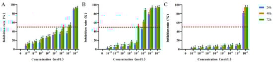 The cell viability was detected using the cell counting kit-8 (CCK-8, BeiRen Chemical Science and Technology Ltd., Beijing, China). Cells at the logarithmic growth stage were seeded at 5000 cells/well with 100 µL medium in 96-well plates and routine-cultured in an incubator at 37 °C with 95% humidity and 5% CO2 for 24 h. The wells were divided into 6 rows and 10 columns. Column 1 was the blank group (containing culture medium), column 2 was the negative control group (containing cells and culture medium and DMSO, the concentration of DMSO was the same as that of the 10−4 drug concentration group), and columns 3 to 10 were the drug treatment groups (containing cells, culture medium, and drugs of different concentrations). Each group contained six wells. After 24 h, the original culture medium was discarded and 100 μL culture medium containing different concentrations of drugs was added to the corresponding group. The same amount of complete medium was added to the blank and negative control groups and the remaining marginal wells were filled with 0.9% normal saline. The 96-well plates were incubated for 24 h, 48 h, and 72 h. After incubation, the medium was removed and CCK-8 solution (10 µL CCK-8 in 100 µL culture medium) was added to each well and incubated for 4 h. The optical density (OD) was determined using a microplate reader at 450 nm. The mean OD value of the six wells was calculated, and each experiment was repeated three times. Inhibition rate = [(Ac − As)/(Ac − Ab)] × 100% (As, the absorbance of the drug treatment group; Ac, the absorbance of the negative control group; Ab, the absorbance of the blank group).
