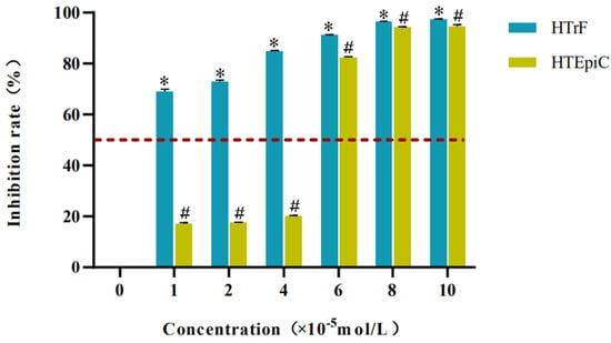 The inhibition rate of different concentrations of rapamycin on HTrF and HTEpiC. * represents a statistically significant difference compared to the negative control group (HTrF), p < 0.05; # represents a statistically significant difference compared to the negative control group (HTEpiC), p < 0.05.