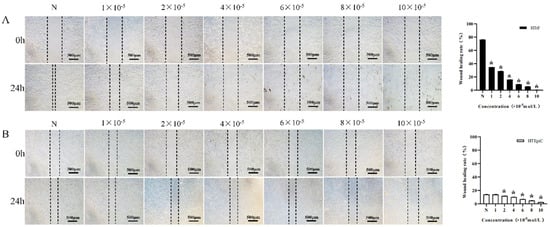 In the concentration range of (1–4) × 10−5 mol/L, the inhibition rate of rapamycin on HTrF was more than 50%, and that on HTEpiC was less than 20% (p < 0.05). In the concentration range of (6–10) × 10−5 mol/L, the inhibition rate of rapamycin on HTrF and HTEpiC was more than 50% (p < 0.05) (Figure 3).