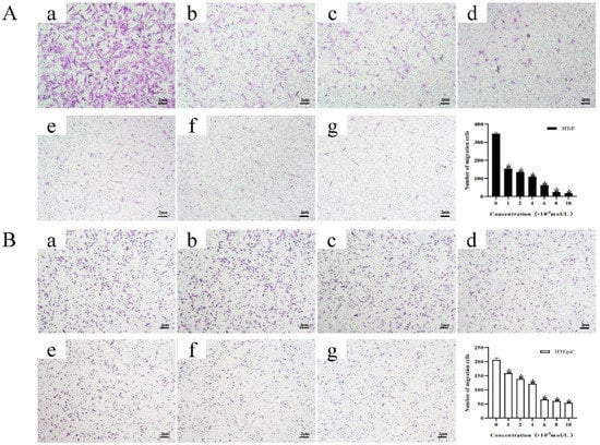 The number of migrated HTrF cells in the negative control and 1 × 10−5, 2 × 10−5, 4 × 10−5, 6 × 10−5, 8 × 10−5, and 10 × 10−5 mol/L rapamycin concentration groups were (347.4 ± 6.73), (153.8 ± 6.09), (134.5 ± 4.91), (109.3 ± 2.60), (61.7 ± 1.51), (24.11 ± 3.77), and (17.56 ± 1.60), respectively. The number of migrated cells in each group was lower than that in the negative control group, and the differences were statistically significant, p < 0.05 (Figure 5A).