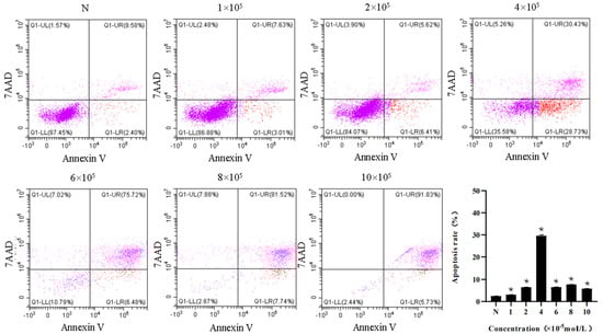 The apoptosis rates of HTrF in the negative control and 1 × 10−5, 2 × 10−5, 4 × 10−5, 6 × 10−5, 8 × 10−5, and 10 × 10−5 mol/L rapamycin concentration groups were (2.43 ± 0.04)%, (3.10 ± 0.03)%, (6.48 ± 0.04)%, (29.57 ± 0.43)%, (6.50 ± 0.12)%, (7.68 ± 0.11)%, and (5.83 ± 0.05)%, respectively. The apoptosis rate in each group was higher than that in the negative control group, and the differences were statistically significant (p < 0.05) (Figure 6).