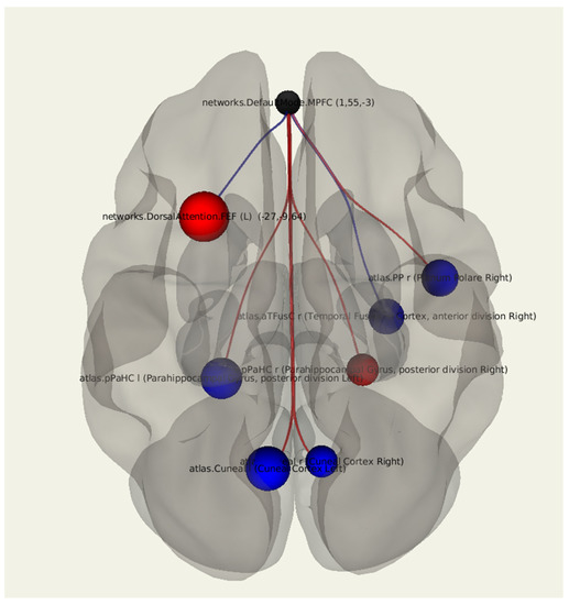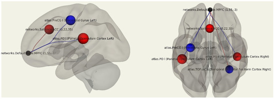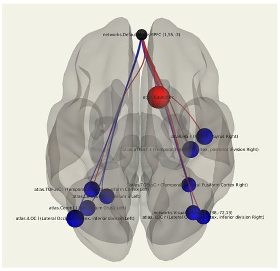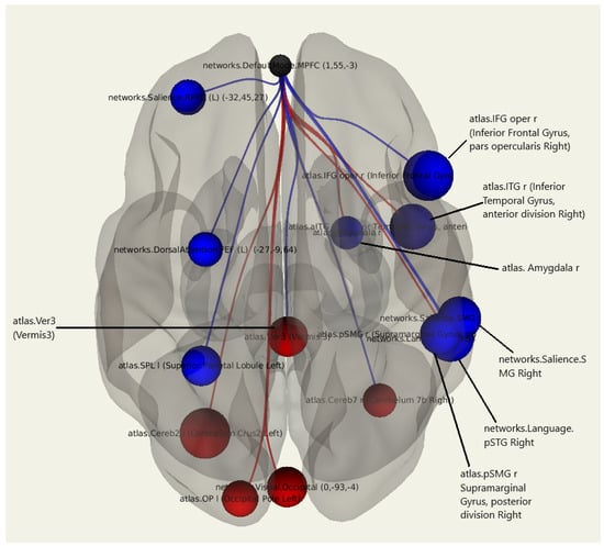 Three-dimensional reconstruction of the functional connections between the MPFC and various areas of the brain in a group of patients after breast cancer treatment with the presence of lymphedema using seed-based analysis. Positive functional connections between the MPFC and the zones of interest are indicated in red, and negative ones are indicated in blue.
