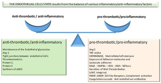 The endothelial cells state results from the balance of various inflammatory/anti-inflammatory factors.