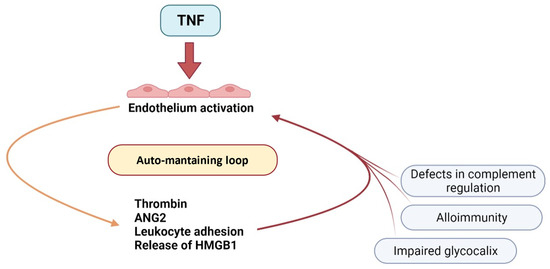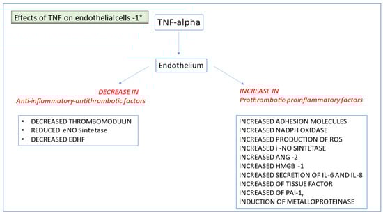 TNF-α is a cytokine produced by macrophages and lymphocytes [24,25]; TNF-α is considered the orchestrator of immunity; it plays a pivotal role in endothelial activation. The effects of TNF-α on EC are multiple, apart from inducing IL-6, IL-8, and the production of chemokines. TNF-α determines an increased expression of adhesions molecules on endothelium; other effects of TNF-α are the induction of iNO, production of ROS, NADPH oxidase increase, increased thromboplastin synthesis, reduction in thrombomodulin, increased PAI-1, induction of metalloproteinase, increased angiopoietin-2, and of an alarmin called HMGB-1 [26,27,28,29,30,31]. All these factors result in endothelium prothrombotic and inflammatory activation and increased vascular permeability (Figure 3).